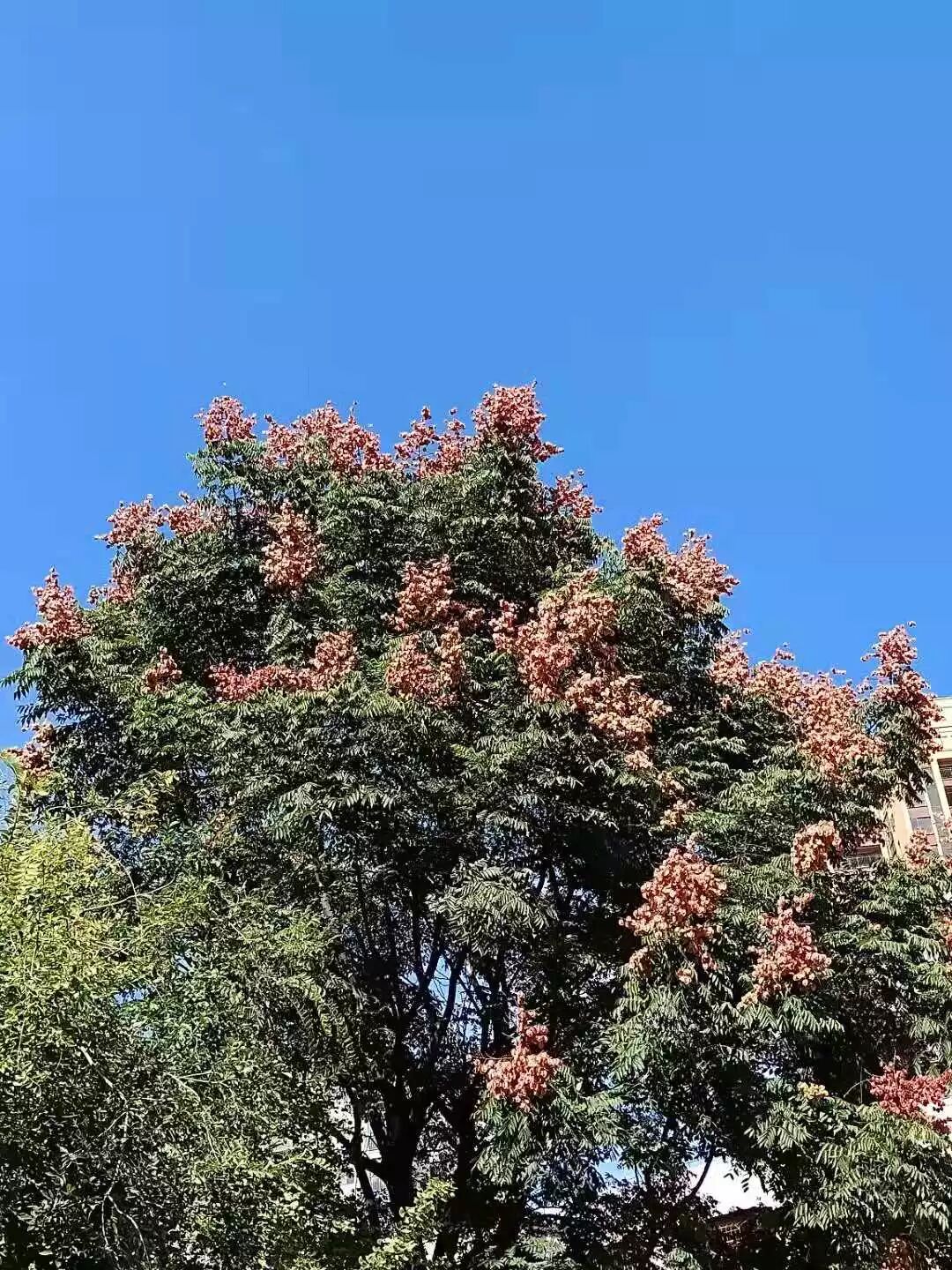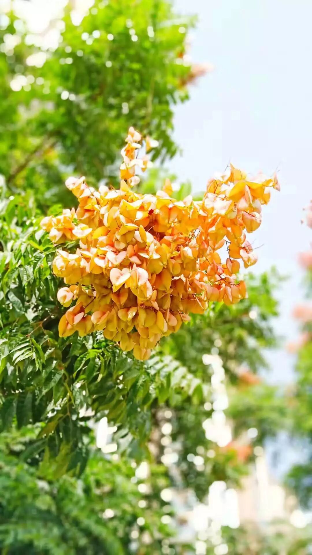 栾树春季嫩叶多为红叶,夏季黄花满树,入秋叶色变黄,果实紫红,形似灯笼,十分美丽。秋天,葱茏华盖上,密密麻麻的蒴果像无数的小铃铛,鹅黄、嫰青与粉红相见,异样地美丽
